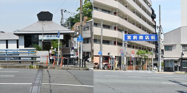 400メートルほど歩くと、左手に青木橋、道路を挟んで向かい側に京急神奈川駅と宮前商店街のアーチが見えてきた。