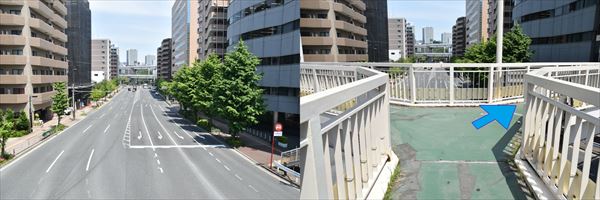 青木橋を渡ると信号機があるので右折して直進、ほどなくして青木通の歩道橋に辿り着く。