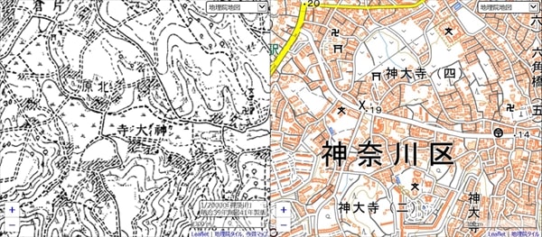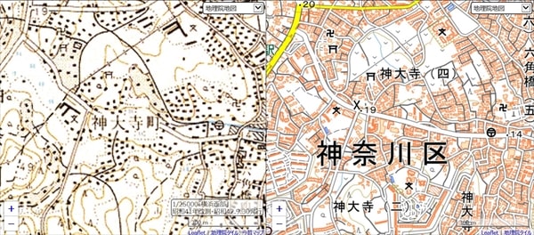 下の地図は、現在と1906(明治39)年の神大寺周辺を比較したものだ。