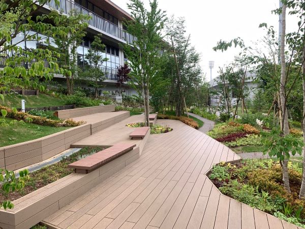 庭園はウッドデッキ風で構成されて、雨でも足元が滑りにくくなっている