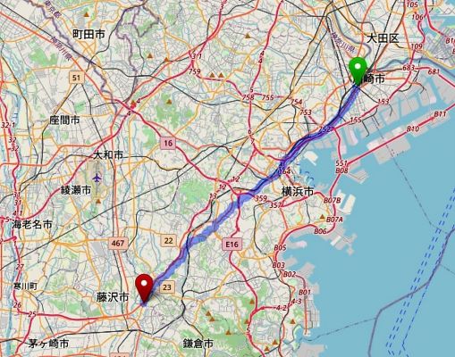 緑のポイントはJR南武線と京浜急行線の八丁畷(はっちょうなわて)駅のやや南に位置する鶴見区・市場上町(いちばかみちょう)の交差点。そして赤いポイントは戸塚区・鉄砲宿(てっぽうじゅく)交差点を少し南に下った藤沢市との市境だ。もちろん、青で描いたラインはアバウトな道筋にすぎない。