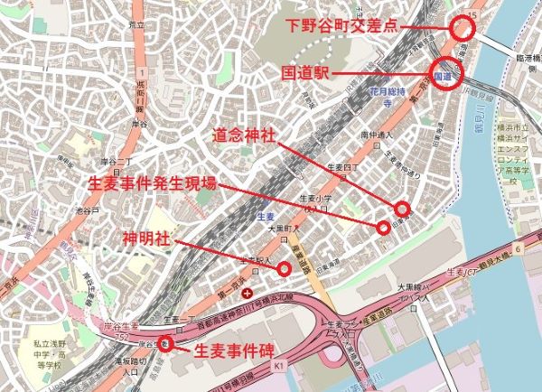 しかし、そのうちの1人リチャードソンは深手を負い、この先1km足らずのところで絶命。今、そこには「生麦事件碑」が建っている。また2人は、ここから5km以上先の本覚寺のアメリカ領事館に逃げ込み、唯一の女性はさらにその先の居留地まで無事逃げ帰る。