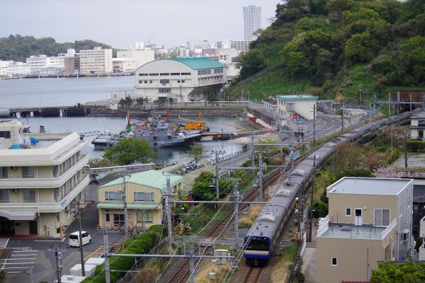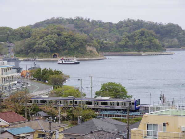 田浦駅を出てトンネルを2つ抜けたら、久里浜方面に向かって左手すぐ近くまで港の海が迫る絶景ポイント!横須賀線全体を通しても海が見られる場所はここだけなので、ぜひとも車窓から眺めてほしい。