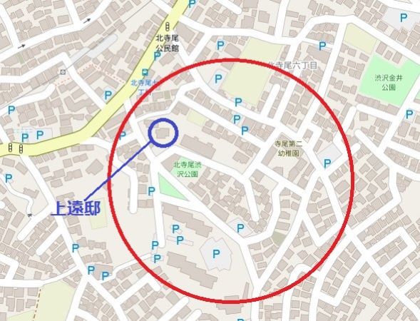そして、右側の現在の地図をさらに拡大して、そこに上遠邸をマークしてみると、こうなる。