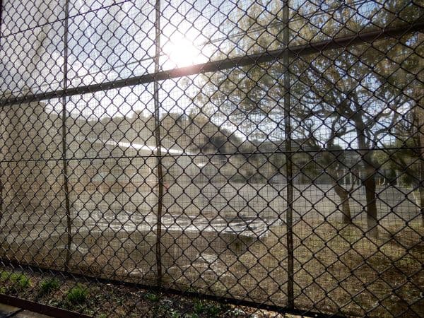 磯子小学校の裏手から、フェンス越しにかつての「磯子山」と思われる丘陵地を望む