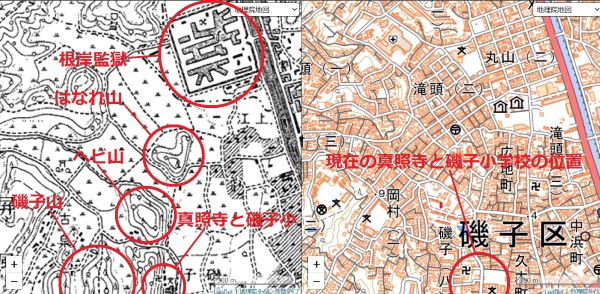 下は1906(明治39)年に測量された地図と現在の地図を比較したものだ。磯子小学校は1873(明治6)年に真照寺境内に開校された「小学真照学舎」を起源とするので、この頃はもうすでに存在していた。