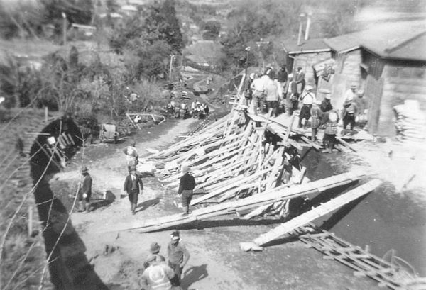 遷座工事当時の上の写真の場所は、おそらく現在の岡村公園野球場付近と思われる。モンペとかっぽう着姿の女性たちは、婦人会の面々だろうか。