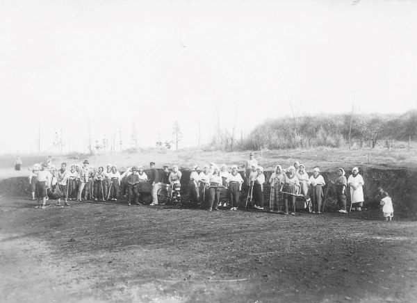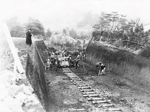 起伏の多い原野の参道普請。1935(昭和10)年頃(磯子図書館所蔵、岡村天満宮提供)