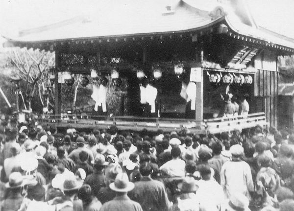 定かではないがその時のお神楽だろうか。昭和初期(磯子図書館所蔵、岡村天満宮提供)