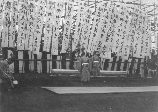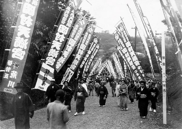 普請された参道を上って会場入り口に入っていく人々(磯子図書館所蔵、岡村天満宮提供)