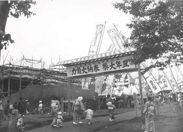 この日のために建てられた相撲小屋(磯子図書館所蔵、岡村天満宮提供)