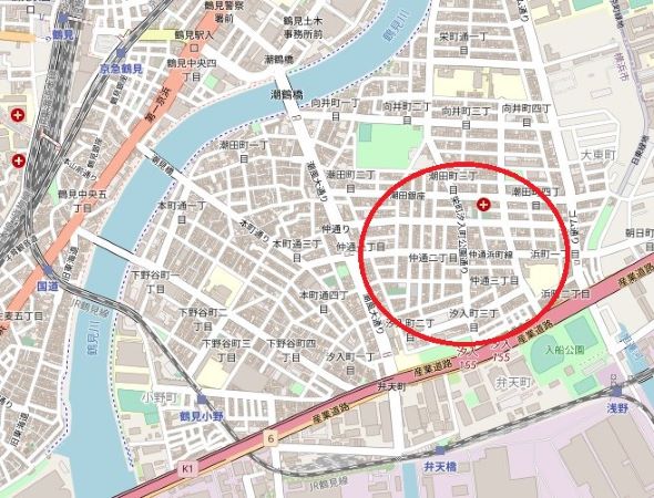 下のマップの赤いラインが、京急鶴見駅から仲通り一丁目交差点までのルート。距離にして1.2km弱。徒歩15~20分程度というところだ。