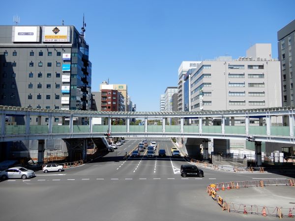 再開発エリア外(上の写真)は現在の線形をできるだけ活かし線幅を拡張し、駅前の再開発エリア内は再開発事業にあわせて、駅前へストレートに到達するよう線形を変更する計画だ。