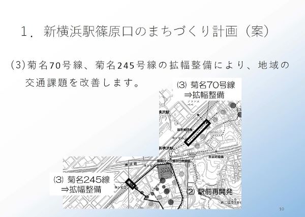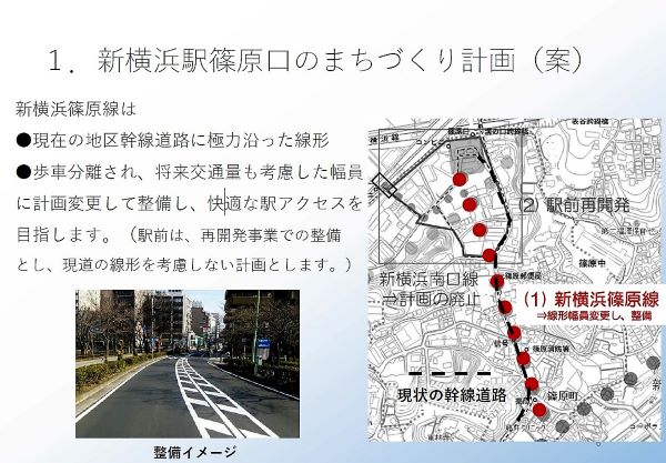 新横浜篠原線の整備については、今回の駅前再開発エリアと、その外に位置する、南下すれば岸根公園へ至る道路とに分けて考えられている。
