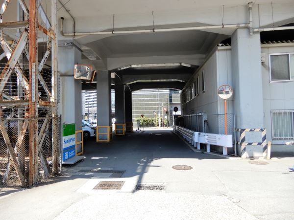 写真の真ん中に高架を支える柱がある。道路はその左側だけだ。柱の右側はファミリーマートの駐車場で、見ての通り道路は車が1台通るのがやっとの道幅である。