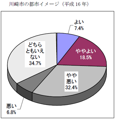 やや古いが、平成16年の川崎市調査による市外から見た川崎のイメージでも、「悪い」と「やや悪い」の合計が39.2%で、「良い」「やや良い」の合計は25.5%となっている。また、具体的イメージでは「産業の町」「公害の町」「労働者の町」となっている。