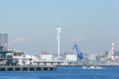その名も「ハマウィング」。横浜風力発電所の風力発電装置だ。高さ118m、日没後はライトアップを実施しており、年に一度は見学会を開催しているそうだ。