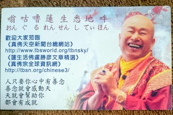 「真佛宗」は台湾独自の新興宗教で、仏教における「顕教(けんきょう)」と「密教」、中国で盛んな「道教」を融合している。教えとしては、良い心構えで良い言葉を発し、どんな悪行もせずに善い行いをしながら、心を清めることが満願成就に繋がるだろう、ということのようだ。