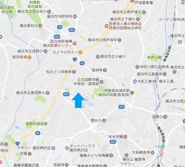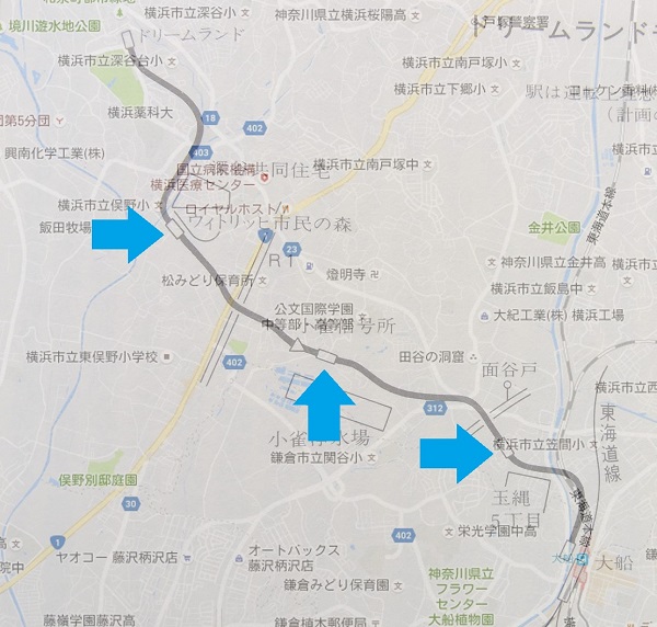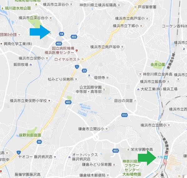 大船駅(緑矢印)と元「ドリームランド」(青矢印)の間を結んでいた(Googlemapより)