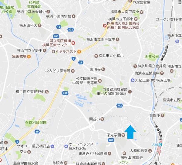 レールは玉縄台の住宅地の脇を走っていた(青矢印)(Googlemapより)
