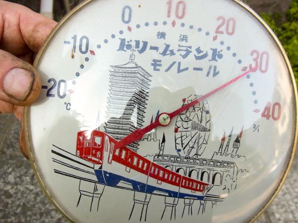 男性が持参している開通記念に買ったモノレールの温度計はまだ作動している