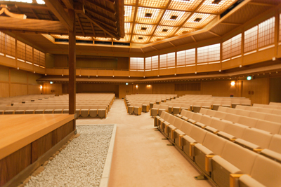 舞台は見所に向かって大きく斜めに張り出していて、本舞台、囃子方などが座る後座(あとざ)、地謡が座る地謡座(じうたいざ)、橋掛かり(はしがかり)と、大きく4つの部分にわかれている。橋掛かりの先にある揚幕(あげまく)の向こうは鏡ノ間(かがみのま)だ。