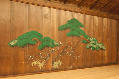本舞台は4本の柱で囲まれた5.91m(京間3間)四方。その横に張り出しているのが地謡座。本舞台の真後ろにあるのが後座で、その背後には鏡板がある。通常は松しか描かれない鏡板だが、この本舞台では通常より細い松に白梅、そして根笹が描かれている。梅は、前田家の家紋の剣梅鉢(けんうめばち)にちなんだもの。鏡板に梅が描かれているのは、この染井能舞台だけだ。